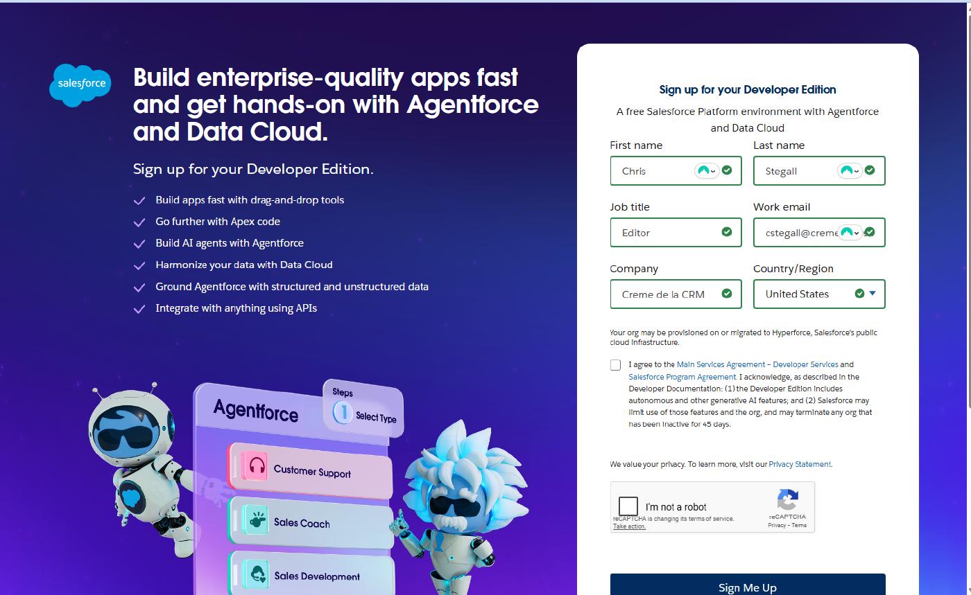 This link will take you to the Salesforce page where you can request your own Agentforce Developer Edition — a free, fully functional playground to explore Agentforce features, experiment with prompts, and test integrations.