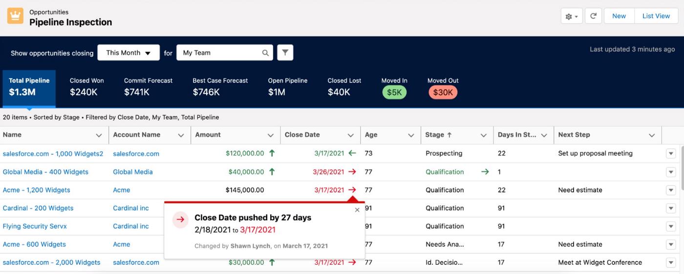 Pipeline Inspection gives sales teams (and execs) a consolidated & interactive report of pipeline metrics, opportunities, weekly changes, AI-based insights, close date estimations, & various activity information. With this type of intelligence, sales teams can focus on the most important opportunities and forecast revenue more accurately.